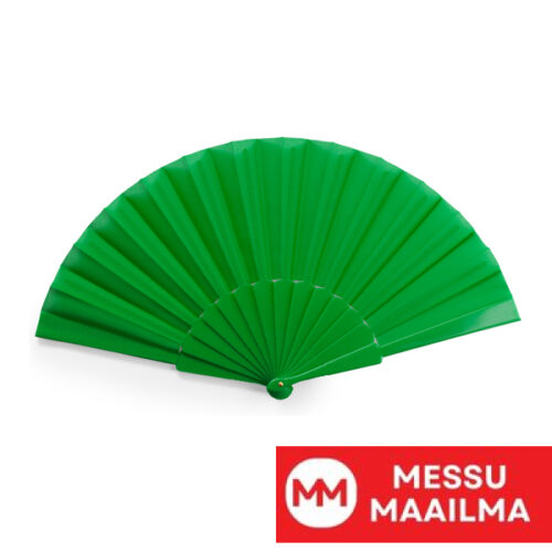 Käsiviuhka, jossa muovirivat ja polyesterikangas.
