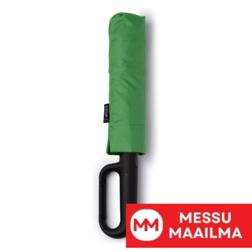 Taittuva RPET-materiaalista valmistettu sateenvarjo, jossa automaattinen avautuminen ja sulkeutuminen. 190T pongee-kangasta. Lasikuitutangot, joissa lumimyrskysuoja ja integroitu karbiinihaka. Tarranauhakiinnitys. Mukana yhteensopiva suojus.