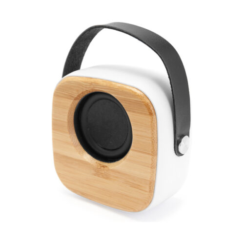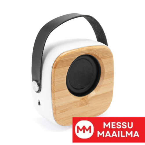 Langaton Bluetooth-kaiutin, jossa ABS-runko, bambuinen etuosa ja näkyvä kalvo. Mukana keinonahkainen kantokahva. Virta: 3 W:n ladattava akku. Kaapeli sisältyy hintaan.