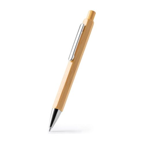 Kuusikulmainen kynä, jossa metallirunko ja bambuinen painike. Kromiset yksityiskohdat. Sininen muste.