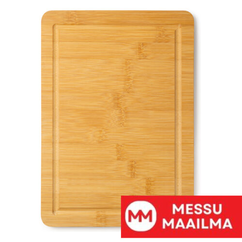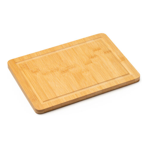 Suorakaiteen muotoinen bambuinen leikkuulauta mehureunuksella.