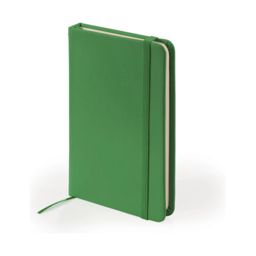 A5-kokoinen muistikirja keinonahkakannella. Kirjanmerkki ja kuminauha. 100 viivoitettua sivua.