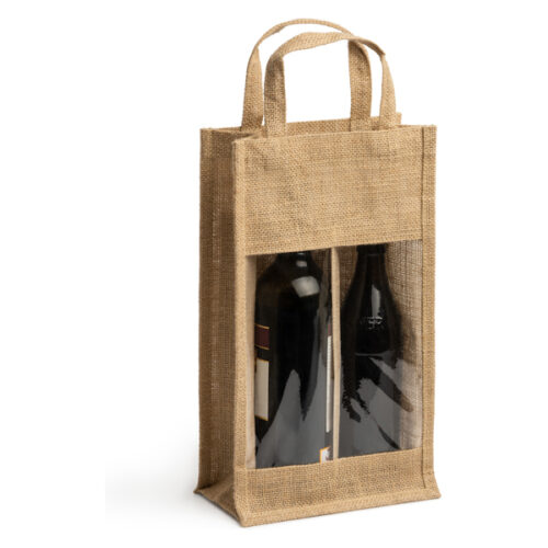 Laminoitu juuttipussi ikkunalla ja kahdella lokerolla. Täydellinen pulloille. Vahvistetut kahvat.