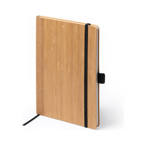 A5-kokoinen muistikirja, jossa bambu- ja korkkikannet. Kynäteline. Sivutussi ja kuminauha. 80 viivoitettua arkkia.