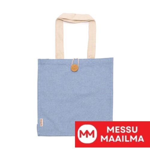 Kierrätetystä puuvillasta valmistettu kassi meleeratulla viimeistelyllä. Vahvistetut 70 cm pitkät kahvat. Nappikiinnitys.