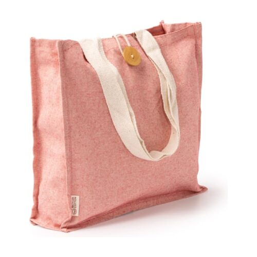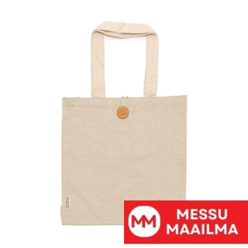 Kierrätetystä puuvillasta valmistettu kassi meleeratulla viimeistelyllä. Vahvistetut 70 cm pitkät kahvat. Nappikiinnitys.
