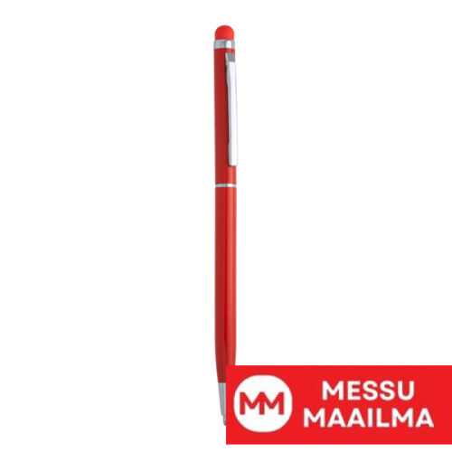 Alumiininen kynä, jossa on kierrettävä mekanismi ja samanvärinen kosketusosoitin. Sininen muste.