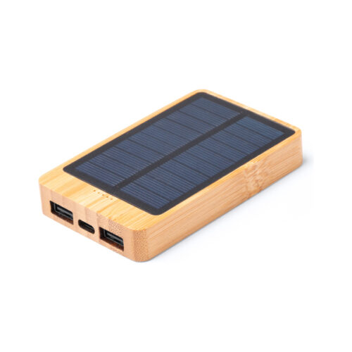 4 000 mAh:n aurinkokennovirtapankki bambusta. C-tyypin sisääntulo. Yksi C-tyypin ja kaksi USB-lähtöä.
