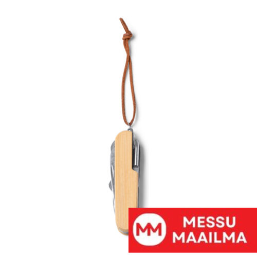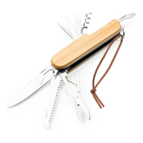 Monikäyttöinen linkkuveitsi, jossa ruostumattomasta teräksestä valmistetut lisävarusteet ja bambusta valmistettu runko. 9 toimintoa. Mukana keinonahkainen kantohihna.