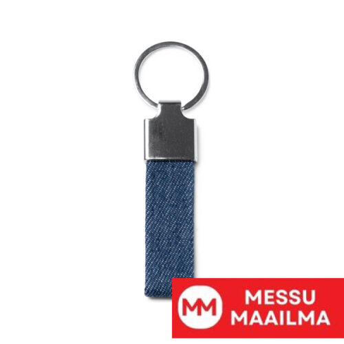 Suorakaiteen muotoinen avaimenperä farkkukankaasta.
