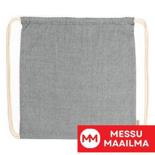 Kiristysnyörillä varustettu kassi, joka on valmistettu 120 g/m² kierrätyspuuvillasta, meleerattu ja viimeistelty luonnonvärisillä nyöreillä. Saatavilla eri väreissä.