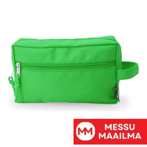 Meikkilaukku, jossa kaksi vetoketjullista lokeroa ja yhteensopiva kantohihna. Hihnan sisällä vetoketju ja ulkopuolella RPET-logotarra.
