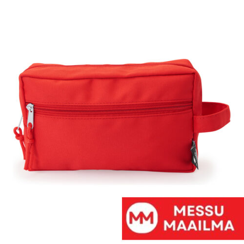 Meikkilaukku, jossa kaksi vetoketjullista lokeroa ja yhteensopiva kantohihna. Hihnan sisällä vetoketju ja ulkopuolella RPET-logotarra.