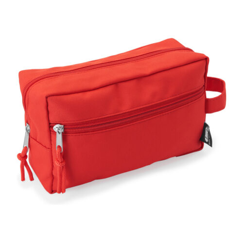 Meikkilaukku, jossa kaksi vetoketjullista lokeroa ja yhteensopiva kantohihna. Hihnan sisällä vetoketju ja ulkopuolella RPET-logotarra.