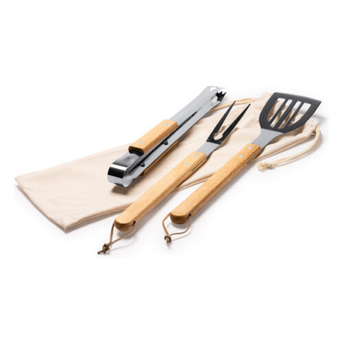 Grillisarja. 3 ruostumattomasta teräksestä valmistettua lisävarustetta puisilla kahvoilla: lihaleikkuri, pihdit ja lasta. Sisältää puuvillapäällisen.
