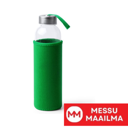 Lasipullo, jonka tilavuus on 500 ml, ja neopreenista valmistettu kotelo sekä värillinen kantohihna.