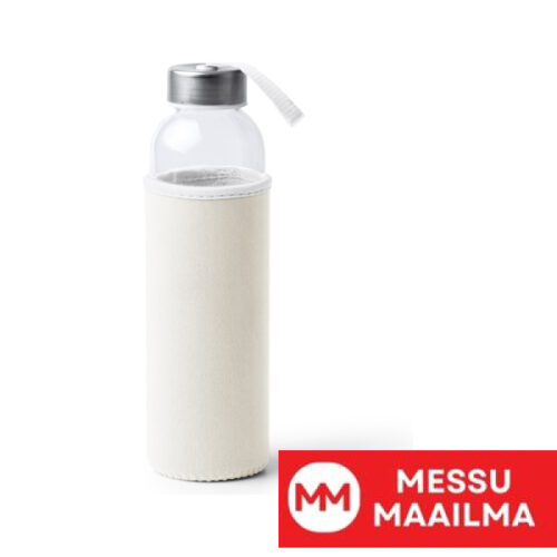 Lasipullo, jonka tilavuus on 500 ml, ja neopreenista valmistettu kotelo sekä värillinen kantohihna.