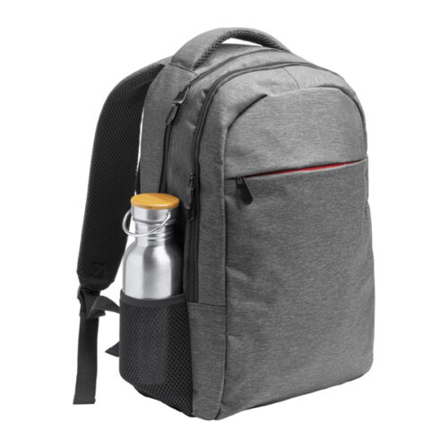 Polyesteristä valmistettu läppärireppu meleeratulla viimeistelyllä. Pehmustetut olkahihnat, selkäosa ja kahvat. Tuplalokero edessä ja sivutaskut.