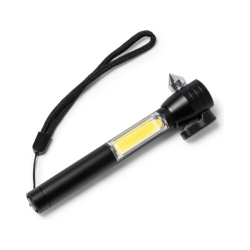 Monitoiminen taskulamppu, jossa on vasara-, lasinsärkijä- ja turvavyönleikkuritoiminnot. Sisältää AAA-pariston. Toimitetaan muotoilurasiassa.