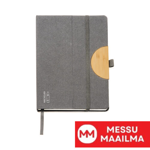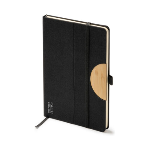 A5-kokoinen muistikirja. Kovakantinen RPET-muovia ja teline. Kuminauha, kirjanmerkki ja kynäteline. 80 arkkia.