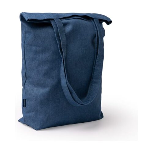 Kierrätetystä denimistä valmistettu laukku, jossa on pohja. 70 cm pitkät kahvat.