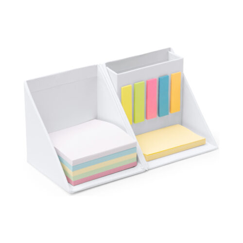 Kuution muotoinen pahvista tehty työpöytäsetti, joka koostuu kynätelineestä, muistivihkosta (250 arkkia) ja 180 erivärisestä tarralapusta.