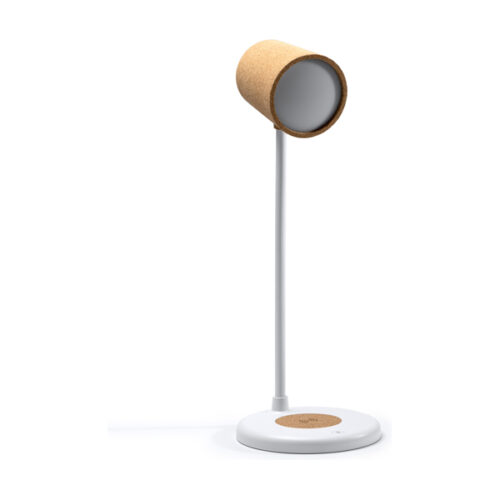 Pöytävalaisin korkkiyksityiskohdilla, sisäänrakennetulla 10 W:n langattomalla laturilla ja 3 W:n langattomalla kaiuttimella. LED-valo, jossa kolme salamatilaa.