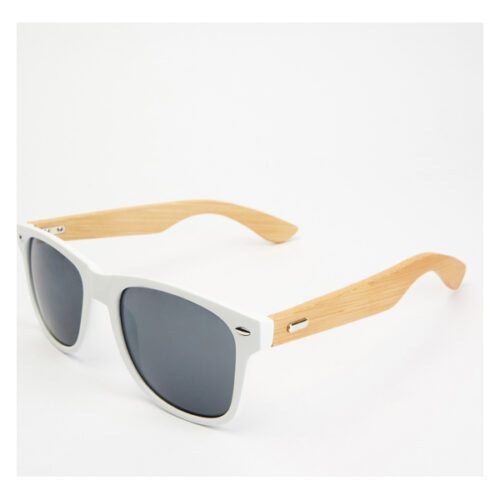 Tyylikkäät aurinkolasit kiiltäväpintaisilla kehyksillä ja luonnonbambusilla sangoilla. UV400-suojaavat linssit.
