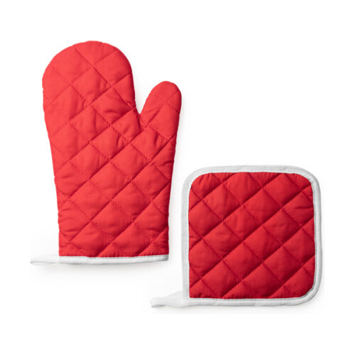 Keittiösetti, jossa patalappi ja kinnas. Pehmeää puuvillaa/polyesteria. Toinen litteä puoli sopii erinomaisesti merkkausta ja ripustushihnaa varten. Saatavilla eri väreissä.