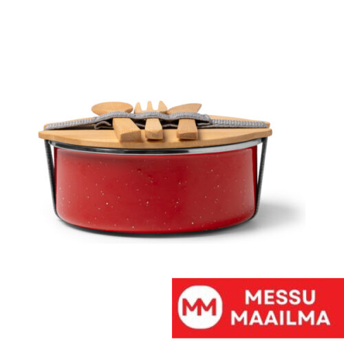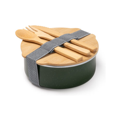 Keraaminen päällysteinen metallinen lounasrasia, jossa bambuinen kansi ja joustava kiristysnauha. Mukana bambuinen aterinsetti. Tilavuus: 750 ml. Pakkaus ekologisessa rasiassa.