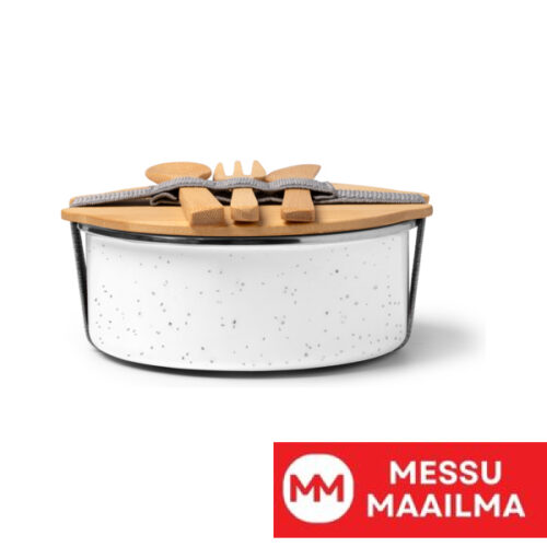 Keraaminen päällysteinen metallinen lounasrasia, jossa bambuinen kansi ja joustava kiristysnauha. Mukana bambuinen aterinsetti. Tilavuus: 750 ml. Pakkaus ekologisessa rasiassa.
