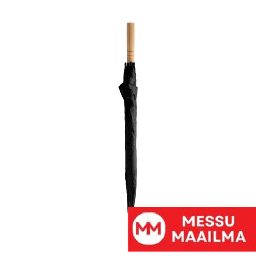Sateenvarjo, jossa puinen kahva ja automaattinen avautuminen. Mustat kaaret ja kärjet. Tarranauhakiinnitys.