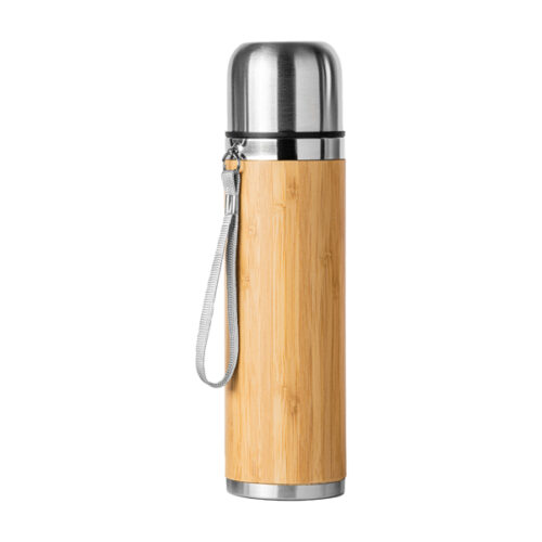 304-teräksestä valmistettu termospullo, jossa on kaksinkertainen seinämä ja bambu. Tilavuus 420 ml. Mukana kantohihna. Elegantti ja ehjä termospullo.
