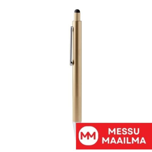 Alumiininen kuulakärkikynä, jossa on metallinhohtoinen raidallinen ote ja kosketusosoitin. Jumbo-mustetäyttöpakkaus sinisenä.