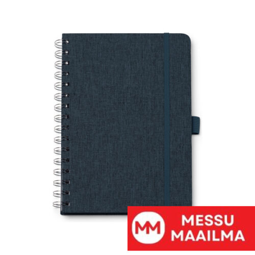 Kierrätetystä RPET-polyesterikankaasta valmistettu A5-kokoinen kovakantinen muistikirja, jossa on kaksinkertainen spiraalirengas. Joustava kiinnitysnauha ja kanteen sopiva kynäteline. 80 viivoitettua arkkia.