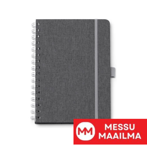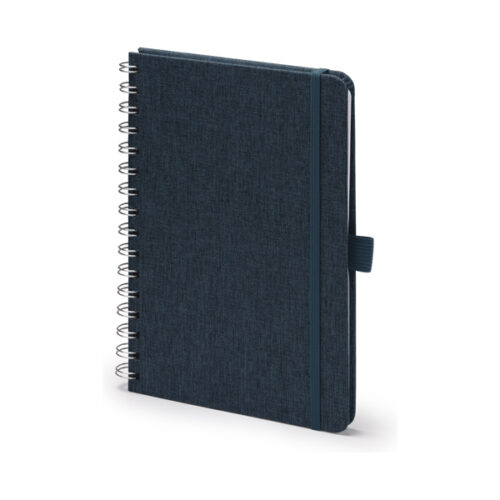 Kierrätetystä RPET-polyesterikankaasta valmistettu A5-kokoinen kovakantinen muistikirja, jossa on kaksinkertainen spiraalirengas. Joustava kiinnitysnauha ja kanteen sopiva kynäteline. 80 viivoitettua arkkia.