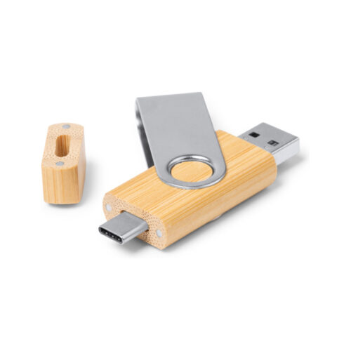 OTG 3.0 USB-muistitikku, jonka runko on valmistettu bambusta. C-tyypin ja USB-sisään- ja ulostuloliitännät. Metallinen pyörivä klipsi, kapasiteetti: 32 Gt. Pakkaus ympäristöystävällisessä laatikossa.