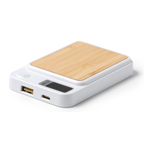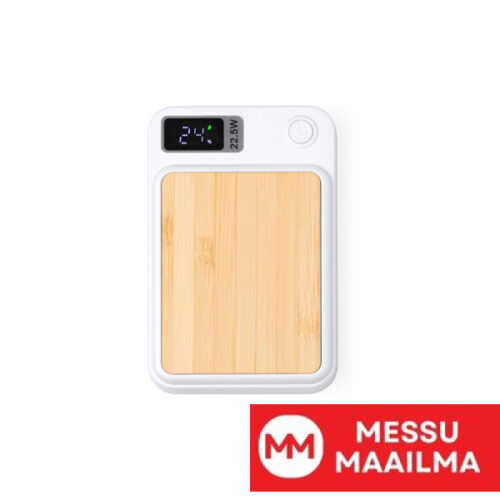 Varavirtalähde, jonka runko on bambua ja kierrätettyä ABS-muovia. 5 000 mAh:n kapasiteetti ja 15 W:n magneettitoiminto. LED-näyttö akun varaustilan ilmaisimella. Mukana tarrarengas. Pakkaus ekologisessa rasiassa.