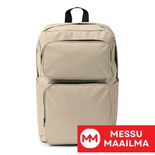 Reppu 600D RPET -materiaalista. Tuplavetoketjullinen etutasku ja kaksi sivutaskua. Pehmustetut kahvat ja selkämys.