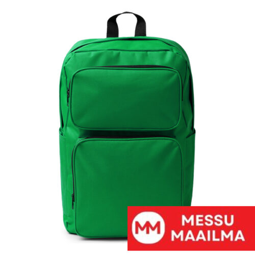Reppu 600D RPET -materiaalista. Tuplavetoketjullinen etutasku ja kaksi sivutaskua. Pehmustetut kahvat ja selkämys.