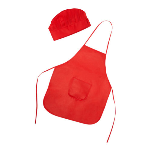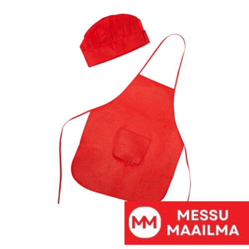 Lasten värillinen kuitukankainen esiliina ja pipo. Säädettävä, yksi koko, pipossa tarranauhakiinnitys.