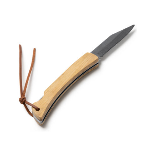 Ruostumattomasta teräksestä valmistettu linkkuveitsi, jossa luonnonbambukahva. Mukana kantohihna.