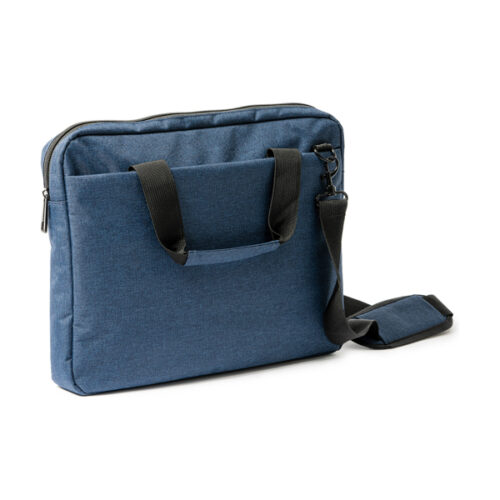 Pehmustettu asiakirjakotelo kannettavalle tietokoneelle, valmistettu 600D RPET kierrätetystä polyesteristä, meleerattu viimeistely. Kaksi lokeroa, joissa vedenpitävä vetoketju. Yhteensopivat kahvat ja säädettävä olkahihna. Mukana kärryhihna.