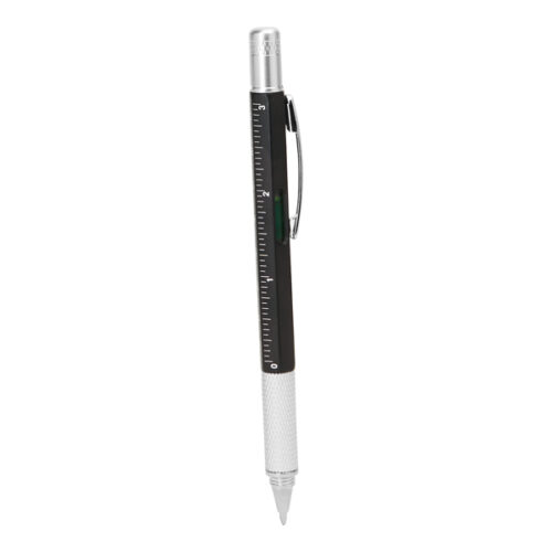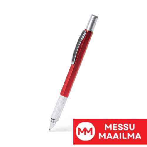 Monitoiminen kuulakärkikynä, jossa on seuraavat työkalut: vatupassi, viivain senttimetri- ja tuumamittauksissa, litteä ruuvimeisseli ja tähtiruuvimeisseli. Runko saatavilla eri väreissä. Pyörivä mekanismi. Sininen muste.