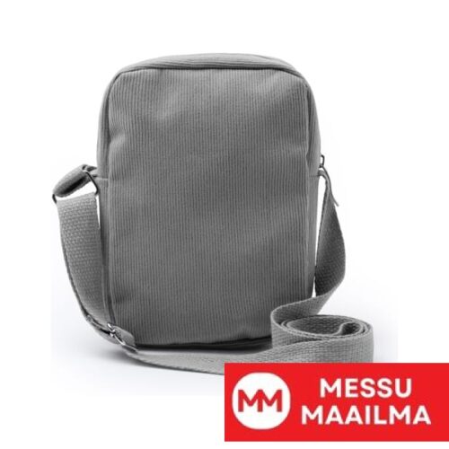 Korduroy-kankaasta valmistettu olkalaukku, jossa vetoketjukiinnitys ja yhteensopiva säädettävä olkahihna.