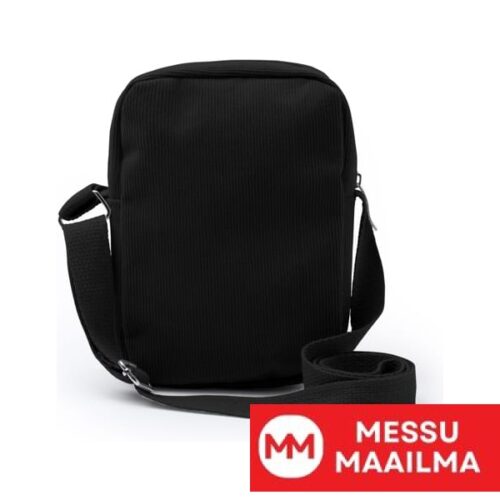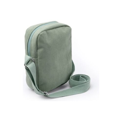 Korduroy-kankaasta valmistettu olkalaukku, jossa vetoketjukiinnitys ja yhteensopiva säädettävä olkahihna.