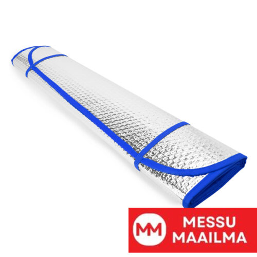 Auton aurinkosuoja, jossa on kuplakuvioiset alumiinisivut. Yläkulmissa kaksi silmukkaa imukupeille. Reunus ja joustavat nauhat taittoa varten saatavilla eri väreissä. Imukupit sisältyvät pakkaukseen.