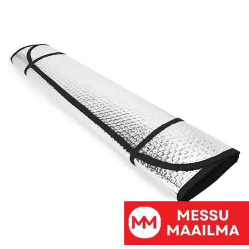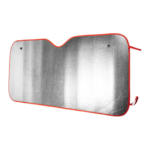 Auton aurinkosuoja, jossa on kuplakuvioiset alumiinisivut. Yläkulmissa kaksi silmukkaa imukupeille. Reunus ja joustavat nauhat taittoa varten saatavilla eri väreissä. Imukupit sisältyvät pakkaukseen.