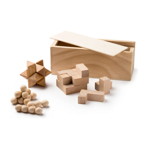 Kolmen luonnonpuusta valmistetun taitopelin setti.