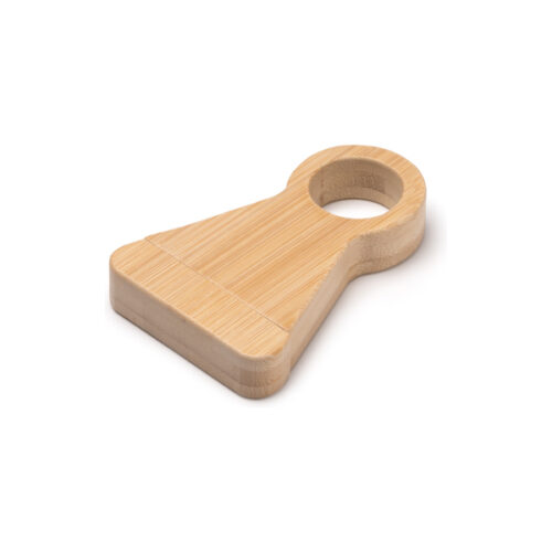 Bambusta valmistettu korkkiruuvi pullotelineellä. Pakattu ekologiseen rasiaan.